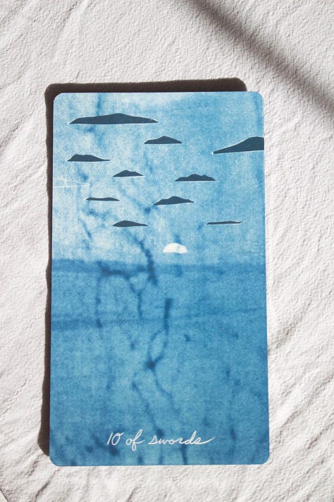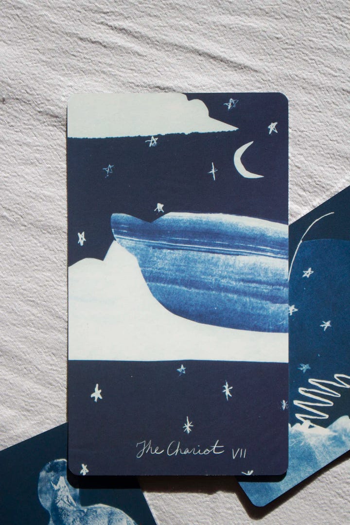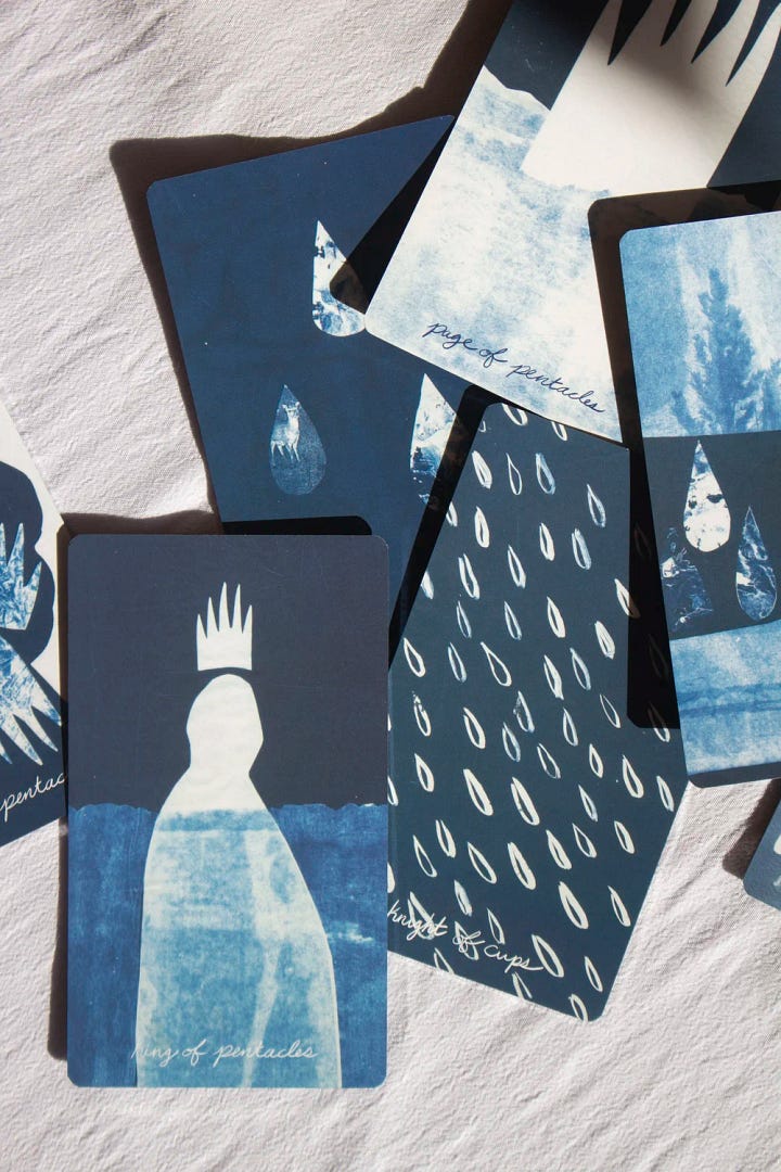 Created by Alyson Davies from collages transformed into their blue state through the photographic cyanotype printing technique. The various shades of blue unfold across the Major Arcana, interwoven with surreal imagery and a profound sense of introspection.